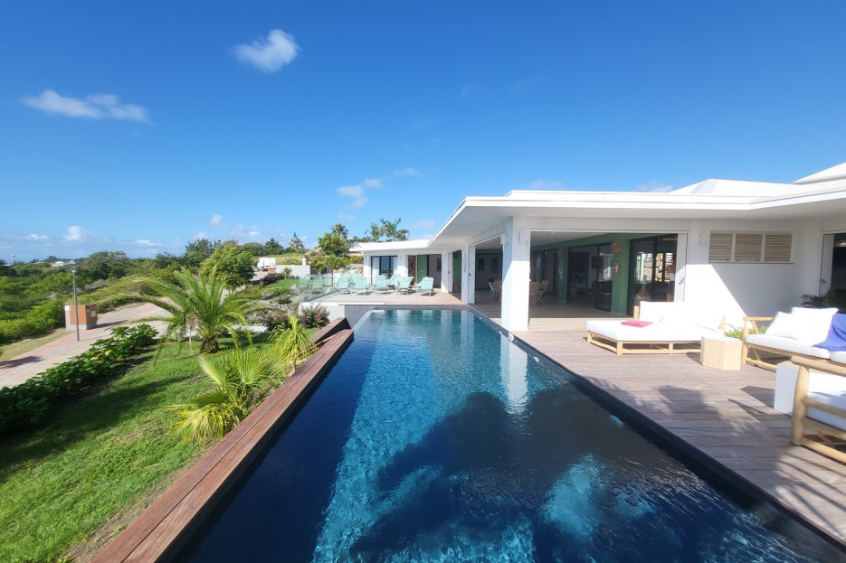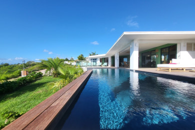 La terrasse spacieuse accueille une grande table à manger, un salon extérieur et une plage de bronzage aménagée avec transats et chaises. Depuis la piscine, la vue est imprenable sur l’aérodrome, la mer et Marie-Galante.