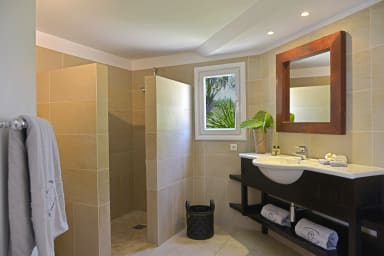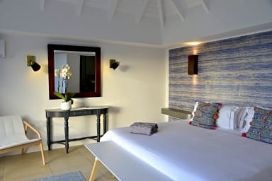 Composée de 6 chambres doubles climatisées, elle permet d’accueillir 12 personnes de manière très confortable et avec des espaces bien distinctes.. L’emplacement des chambres permet de donner une véritable intimité à chacun. Vous trouverez une chambre dans le bâtiment principal, deux autres dans une aile séparée au niveau supérieur (avec espace cuisine, salle à manger et piscine privée), deux encore au niveau inferieur et enfin un bungalow indépendant pour compléter cette offre. Chacune des chambres propose des prestations identiques: lit king-size, coin bureau, rangements, salle de bain attenante et vue sur l’océan.