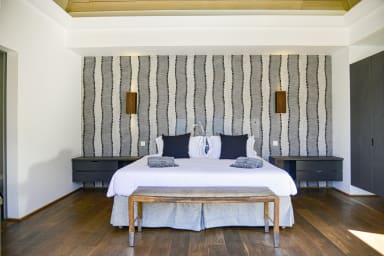 La villa compte sept superbes chambres climatisées, offrant une vue imprenable sur l’océan ou la piscine. Chacune d’elles est spacieuse, équipée d’un lit king-size et d’une salle de bain privative, dans un décor alliant confort moderne et élégance. Les hauts plafonds mansardés renforcent la sensation d’espace et de sérénité, tandis que les textiles raffinés, déclinés dans des tons sobres et harmonieux, apportent une touche de douceur et de raffinement à ces cocons de repos.