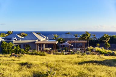 L’extérieur de la villa offre de magnifiques prestations: tout d’abord l’originalité et le luxe d’avoir deux piscines, une sur la terrasse, la seconde à l’arrière. Vous pourrez peaufiner votre bronzage sur les transats ou vous reposer à l’ombre des parasols. Deux salons extérieurs avec de nombreux coussins et canapés ainsi qu’une belle table à manger en bois massif accueilleront vos moments de convivialité. Vous ne vous lasserez pas de la vue époustouflante sur l’horizon; la végétation environnante apporte une touche finale au décor de rêve qu’offre la villa Lagon Vert.