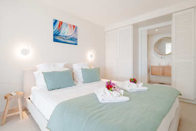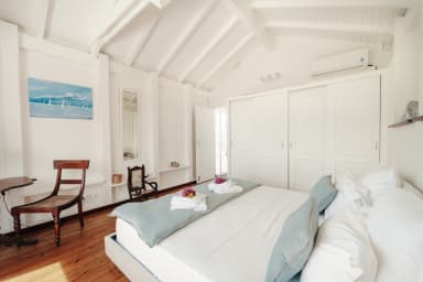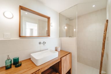La villa dispose de quatre suites parentales climatisées au rez-de-chaussée et de deux chambres familiales climatisées à l’étage, qui se partagent une salle de bains. Toutes disposent de rangements.