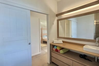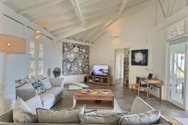 La cuisine, ouverte sur la terrasse avec vue mer, est entièrement équipée : plaque à induction, four, micro-ondes, cafetières (classique et Nespresso), lave-vaisselle… Le séjour, lumineux et élégant, comprend un canapé confortable, une TV connectée et un coin bureau.
