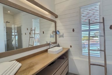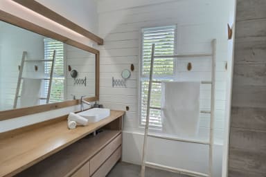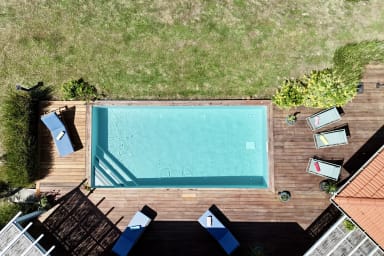 Inspirée par le style balinais, la villa séduit par ses poutres apparentes, ses persiennes laissant filtrer la lumière naturelle et ses espaces ouverts propices à la détente.