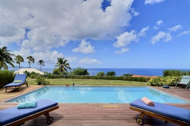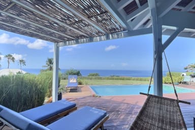 La piscine à débordement, intégrée dans un magnifique deck en bois, invite à la baignade face à la mer des Caraïbes.