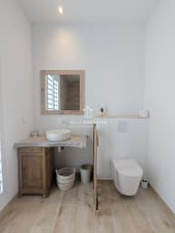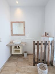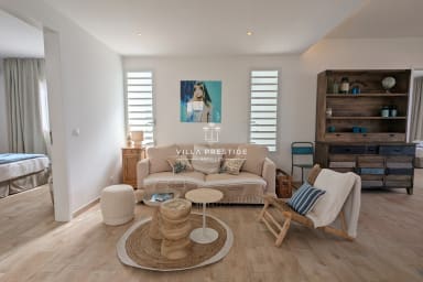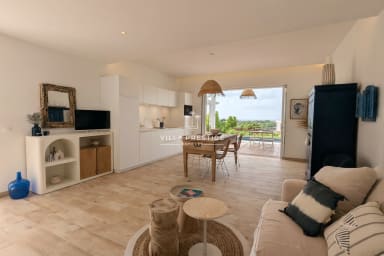 Chaque villa dispose également de son propre espace de vie indépendant, pensé dans le même esprit clair et contemporain. Le salon s’ouvre sur une terrasse intimiste, avec une cuisine moderne parfaitement intégrée et un coin repas convivial.