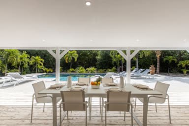 Les espaces intérieurs de la villa sont conçus de manière réfléchie, avec un agencement ouvert qui relie de manière transparente le salon, la salle à manger et la cuisine. Le décor dégage une esthétique tropicale sophistiquée, associant des tons neutres à des touches vibrantes de couleurs inspirées des Caraïbes. Les hauts plafonds et les grandes fenêtres renforcent l'impression d'espace, créant une ambiance aérée qui s'harmonise avec l'environnement tropical.