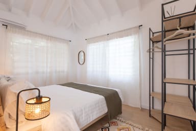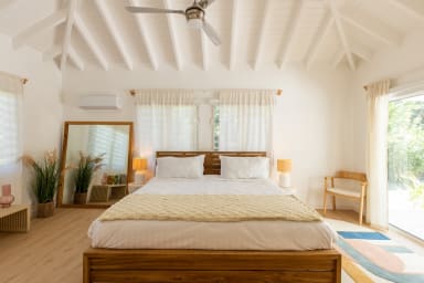 La villa dispose de deux chambres principales, chacune dotée d'une salle de bain privative. La première chambre principale se trouve dans la maison principale et allie harmonieusement l'élégance moderne et le charme tropical. De grandes fenêtres offrent une vue panoramique sur les environs luxuriants et laissent entrer la chaude lumière du soleil des Caraïbes. La salle de bain attenante est dotée d'équipements contemporains et offre une oasis de détente privée.