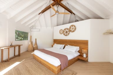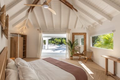 La villa dispose de deux chambres principales, chacune dotée d'une salle de bain privative. La première chambre principale se trouve dans la maison principale et allie harmonieusement l'élégance moderne et le charme tropical. De grandes fenêtres offrent une vue panoramique sur les environs luxuriants et laissent entrer la chaude lumière du soleil des Caraïbes. La salle de bain attenante est dotée d'équipements contemporains et offre une oasis de détente privée.