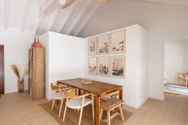 Les espaces intérieurs de la villa sont conçus de manière réfléchie, avec un agencement ouvert qui relie de manière transparente le salon, la salle à manger et la cuisine. Le décor dégage une esthétique tropicale sophistiquée, associant des tons neutres à des touches vibrantes de couleurs inspirées des Caraïbes. Les hauts plafonds et les grandes fenêtres renforcent l'impression d'espace, créant une ambiance aérée qui s'harmonise avec l'environnement tropical.