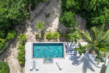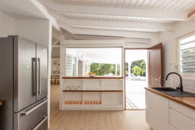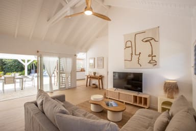 Les espaces intérieurs de la villa sont conçus de manière réfléchie, avec un agencement ouvert qui relie de manière transparente le salon, la salle à manger et la cuisine. Le décor dégage une esthétique tropicale sophistiquée, associant des tons neutres à des touches vibrantes de couleurs inspirées des Caraïbes. Les hauts plafonds et les grandes fenêtres renforcent l'impression d'espace, créant une ambiance aérée qui s'harmonise avec l'environnement tropical.