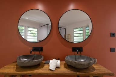 La villa dispose de deux chambres principales, chacune dotée d'une salle de bain privative. La première chambre principale se trouve dans la maison principale et allie harmonieusement l'élégance moderne et le charme tropical. De grandes fenêtres offrent une vue panoramique sur les environs luxuriants et laissent entrer la chaude lumière du soleil des Caraïbes. La salle de bain attenante est dotée d'équipements contemporains et offre une oasis de détente privée.
