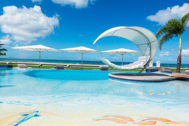 La terrasse en teck entoure la piscine chauffée, un bar extérieur et un jacuzzi face à la mer.
