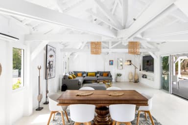 La villa est un véritable havre de paix, conçue dans l’esprit traditionnel des Caraïbes françaises, avec une touche contemporaine. Organisée en plusieurs bungalows distincts, elle permet à chacun de ses hôtes de profiter pleinement de son espace tout en partageant des moments conviviaux autour de la grande piscine centrale. Le salon et la cuisine sont rassemblés dans un bungalow à part, entièrement climatisé, offrant un cadre confortable pour cuisiner, se détendre ou partager un repas en toute intimité.