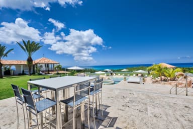 Les espaces extérieurs, sublimés par un mobilier signé Philippe Starck, créent une ambiance sophistiquée et accueillante, idéale pour des moments de convivialité ou de relaxation sous le soleil des Caraïbes.