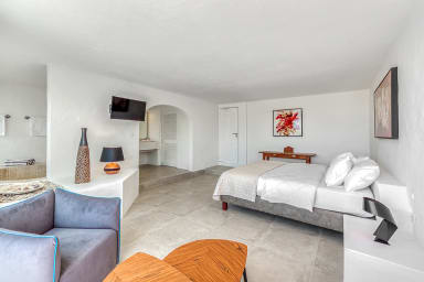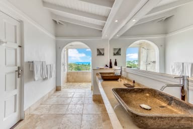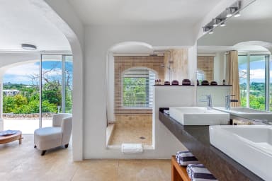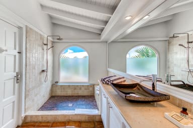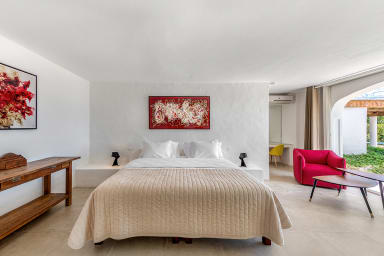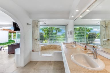 La Villa Belle Fontaine dispose de cinq chambres spacieuses, toutes de taille égale. Trois d'entre elles offrent une vue sur la mer, tandis que les deux autres donnent sur le jardin. Les salles de bains de style spa sont magnifiquement conçues et dotées d'équipements de luxe. Vous y trouverez de grandes douches à l'italienne qui donnent sur la mer ou le jardin, et l'une des salles de bains dispose même d'un patio extérieur privé.
