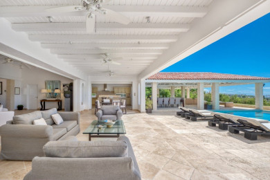 La grande salle de séjour climatisée, avec ses plafonds voûtés et ses multiples coins salons, offre une vue mer omniprésente.