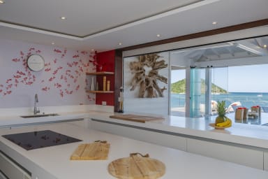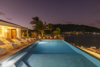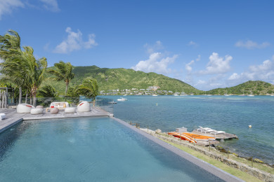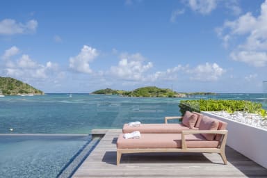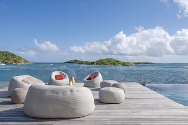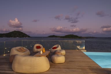 La villa elle-même est conçue avec un mobilier contemporain et dispose d'une spacieuse terrasse en bois et d'une piscine chauffée à débordement qui surplombe l'océan. Que vous commenciez votre journée par un plongeon rafraîchissant dans la piscine ou que vous vous détendiez le soir en admirant le magnifique coucher de soleil, les espaces extérieurs constituent la toile de fond idéale pour la vie dans les Caraïbes.
