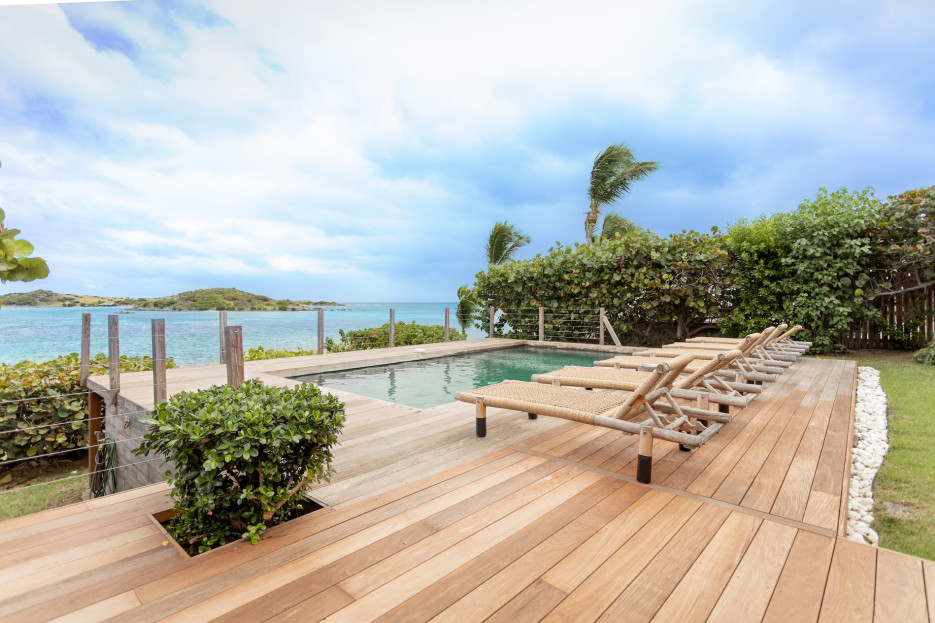 La piscine est idéalement positionnée pour profiter d’une vue dégagée sur la baie de Cul de Sac et l’îlet Pinel, invitant à la détente à tout moment de la journée.