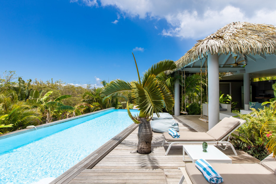 La piscine à débordement, entourée de végétation tropicale, s’intègre parfaitement au paysage et invite à la détente à toute heure de la journée. Une seconde piscine, située au niveau inférieur, complète harmonieusement l’ensemble.