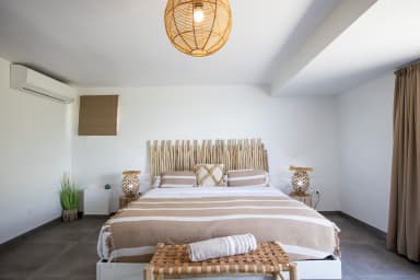 Cette superbe villa comprend 4 chambres à coucher, chacune équipée de sa propre salle de bains. Trois d'entre elles sont situées au niveau supérieur, ce qui leur assure intimité et confort. La quatrième chambre se trouve au niveau inférieur, ainsi qu'une salle de sport où vous pourrez rester actif pendant votre séjour.