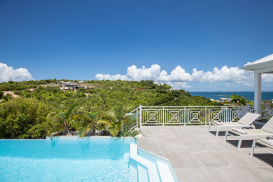 La piscine s’intègre dans un agréable espace terrasse offrant une vue dégagée sur Baie Rouge et les collines environnantes.
