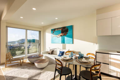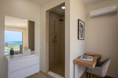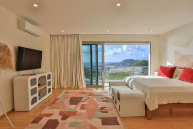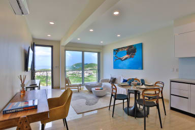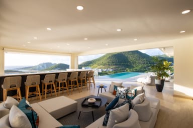 Ce grand espace de vie s'ouvre sur la piscine à débordement qui surplombe l'océan et la magnifique Indigo Bay avec ses collines plongeant dans les eaux turquoise.