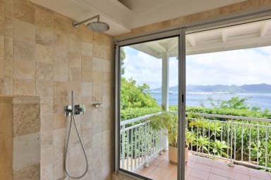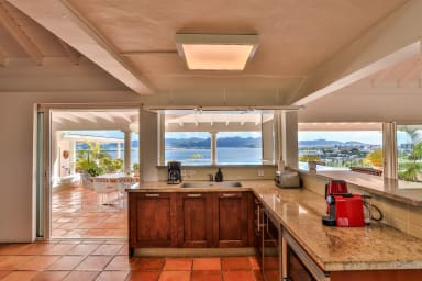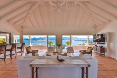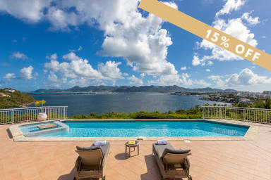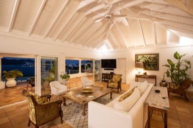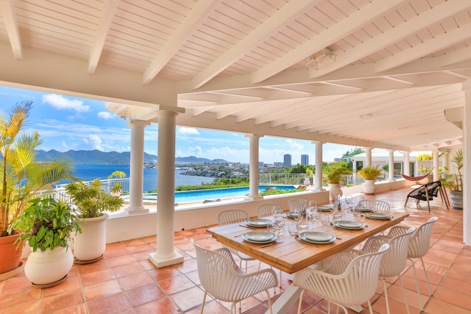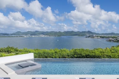 Cette villa à flanc de falaise offre une vue imprenable sur le lagon et les superbes montagnes verdoyantes de Saint-Martin.