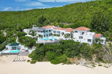 La façade de la villa présente les murs blancs emblématiques de l'architecture grecque, créant un contraste saisissant avec le bleu vibrant du ciel et de la mer des Caraïbes. L'extérieur est orné d'éléments rappelant les îles grecques des Cyclades, avec une architecture en dôme, des portes voûtées et des sentiers en pierre qui serpentent à travers les jardins luxuriants.