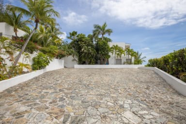 La façade de la villa présente les murs blancs emblématiques de l'architecture grecque, créant un contraste saisissant avec le bleu vibrant du ciel et de la mer des Caraïbes. L'extérieur est orné d'éléments rappelant les îles grecques des Cyclades, avec une architecture en dôme, des portes voûtées et des sentiers en pierre qui serpentent à travers les jardins luxuriants.