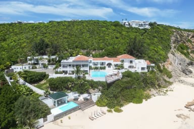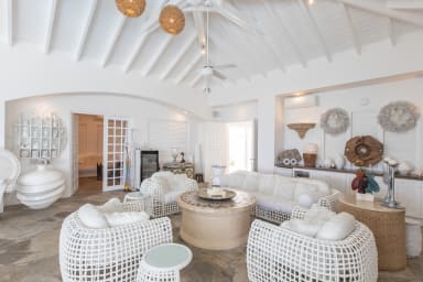 La façade de la villa présente les murs blancs emblématiques de l'architecture grecque, créant un contraste saisissant avec le bleu vibrant du ciel et de la mer des Caraïbes. L'extérieur est orné d'éléments rappelant les îles grecques des Cyclades, avec une architecture en dôme, des portes voûtées et des sentiers en pierre qui serpentent à travers les jardins luxuriants.