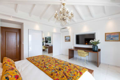 L'intérieur de la Villa Fleurs de Lys est un mélange harmonieux de luxe français classique et d'élégance contemporaine, orné d'œuvres d'art modernes qui rehaussent son ambiance sophistiquée. Le décor comprend des équipements de qualité et des détails raffinés, créant une atmosphère d'opulence et de sophistication.