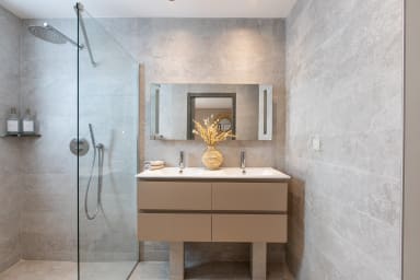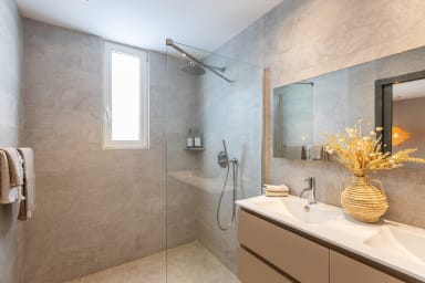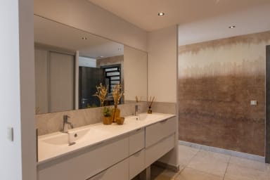 À ce même niveau, vous trouverez les deux premières chambres, idéalement situées à proximité des pièces principales pour un confort optimal. Chacune de ces chambres est aménagée avec des matériaux et des finitions de haute qualité, et bénéficie de sa propre salle de bain privative. L’atmosphère y est sereine et propice à la détente, avec une décoration soignée qui mêle touches de couleurs et matières naturelles, évoquant subtilement la beauté des paysages environnants.