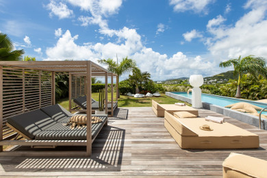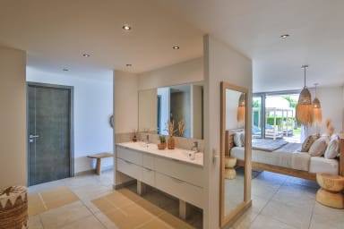 Le niveau inférieur de la villa est un véritable sanctuaire de tranquillité. Ce niveau accueille trois autres chambres, deux d'entres elles orientées vers la piscine privée et disposant d’un accès direct à celle-ci. Ces chambres, également dotées de salles de bain privatives, offrent un cadre intime et apaisant, parfait pour des moments de repos total après une journée passée à explorer les plages et les merveilles naturelles de Saint-Martin. La piscine, entourée de chaises longues et d’espaces de détente, est l’endroit idéal pour profiter du soleil caribéen en toute quiétude, ou pour se rafraîchir avec une baignade à tout moment de la journée.