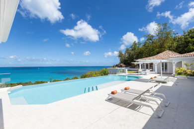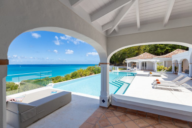 La piscine à débordement chauffée invite à la détente tout en offrant une vue spectaculaire sur l’océan et Anguilla. Les terrasses aménagées constituent de véritables espaces de vie extérieurs, propices au repos et aux moments partagés.
