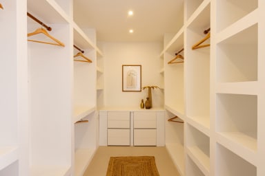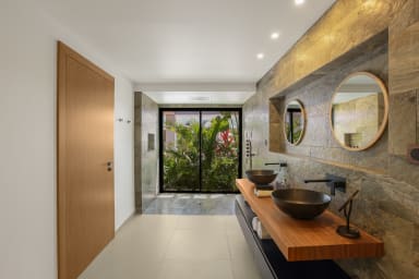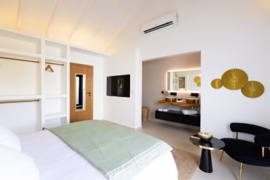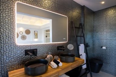 La Villa Nuit Jade propose cinq chambres élégantes, chacune avec sa propre salle de bain privative pour préserver l’intimité de chacun. Quatre chambres se trouvent au niveau principal : deux offrent une vue sur la piscine avec un accès direct à la piscine, tandis que les deux autres, orientées vers le jardin, bénéficient d’une douche extérieure et d’une terrasse privée pour un instant de sérénité absolue. La cinquième chambre est un studio indépendant accessible par l’extérieur. Véritable cocon exclusif, il comprend un salon, une cuisine équipée, une chambre avec salle de bain et dressing. Son lit est composé de twin beds pouvant être séparés selon vos besoins. Ce studio s’ouvre sur une terrasse privative avec transats, parasols et un jacuzzi, parfait pour des moments de relaxation en toute intimité.