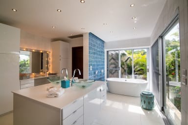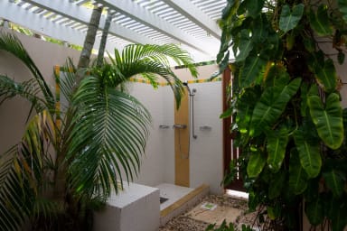 Chacune des chambres de la villa est accompagnée de sa propre salle de bains, sept d'entre elles disposant également d'une douche extérieure. Ce mélange d'espaces de vie intérieurs et extérieurs permet aux hôtes de s'immerger totalement dans la beauté des environs.