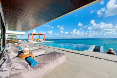 Le salon, doté de hauts plafonds et de larges ouvertures, s’ouvre sur la terrasse principale et la piscine à débordement, créant une atmosphère fluide et apaisante face à l’océan.