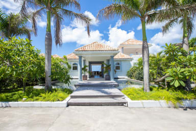 Le jardin luxuriant est rempli du parfum du jasmin, et des bougainvilliers vifs ancrés a de magnifiques palmiers. L'entrée couverte est flanquée de chaque côté de petits bassins plantés de feuillages d'eau. Entrez par la double porte et la vue panoramique à 360 degrés s'offre devant vous comme une peinture murale spectaculaire.