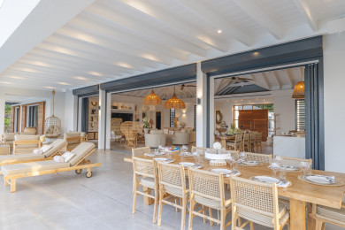 Les espaces repas, intérieurs et extérieurs, sont conçus pour profiter pleinement de la douceur des journées tropicales.