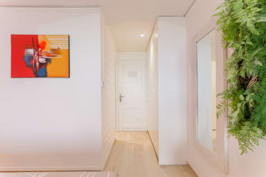 L’appartement s’ouvre sur un salon climatisé baigné de lumière, équipé d’une télévision connectée et d’un coin détente confortable.