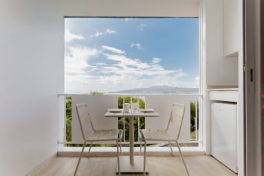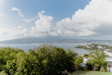 La terrasse privative, aménagée avec un espace repas, permet de profiter de repas face à la mer, avec un panorama exceptionnel sur la baie et Fort-de-France en toile de fond.